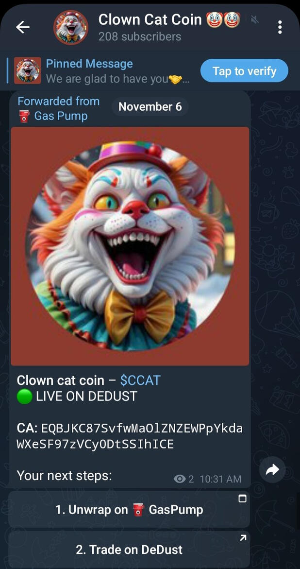 Now let's bragg a little bit about how clean Clown Cat Coin CCAT is 😃👀👇Clown Cat Coin Total Supply 1B* Fully verified on Ton Assets ✅* Whitelisted on Dedust Dex, all Dexes and wallets.* Created in Gaspump launchpad in 2024 (Fair Launch)* Contract renounced.* Listed on Dedust Dex in Nov 6/24.* Liquidity 100% Burnt 🔥 🔥 🔥* Circulating Supply 90.27%* 9.73% Locked between 2 to 4 years. https://tonraffles.app/lock/EQBJKC87SvfwMaOlZNZEWPpYkdaWXeSF97zVCy0DtSSIhICENow go grab a bag good and HODL.CCAT CA 👇EQBJKC87SvfwMaOlZNZEWPpYkdaWXeSF97zVCy0DtSSIhICESOON WE WILL START BUYING AND BURNING TOKEN SUPPLY ENDLESSLY.If all these ain't BULLISH to you, then you still have a lot to learn haha.We are Clown Cats and we are Laughing our way to millions and billions 🤡😃🔥